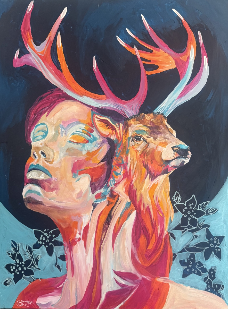 Im Hintergrund treten weibliche Gesichter hervor, die die Beziehung zwischen Mensch und Tier sichtbar machen. Sie stehen für die Kraft der Krafttiere, für Mut, Intuition und innere Stärke. Tier und Mensch erscheinen dabei als Ausdruck derselben Energie.